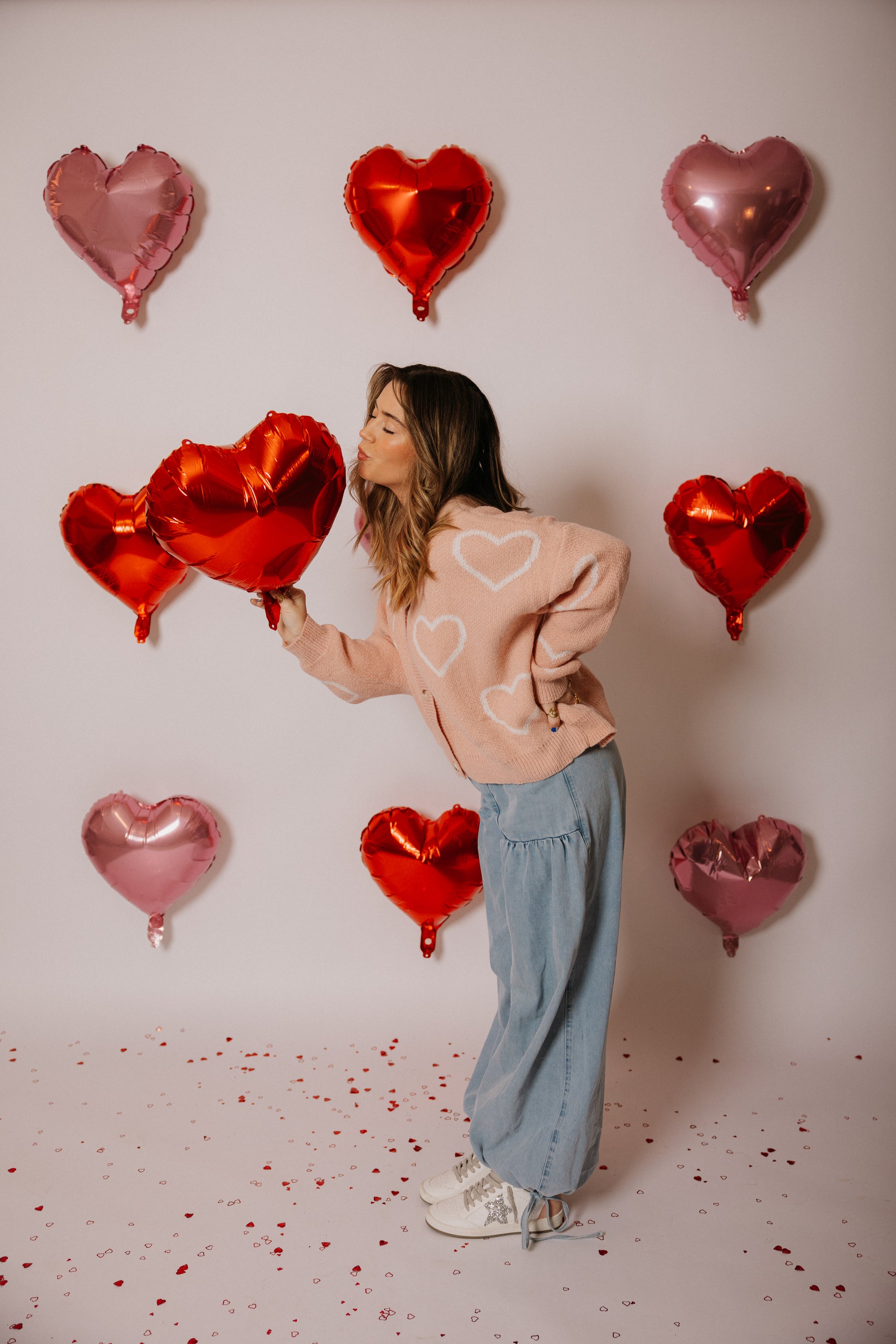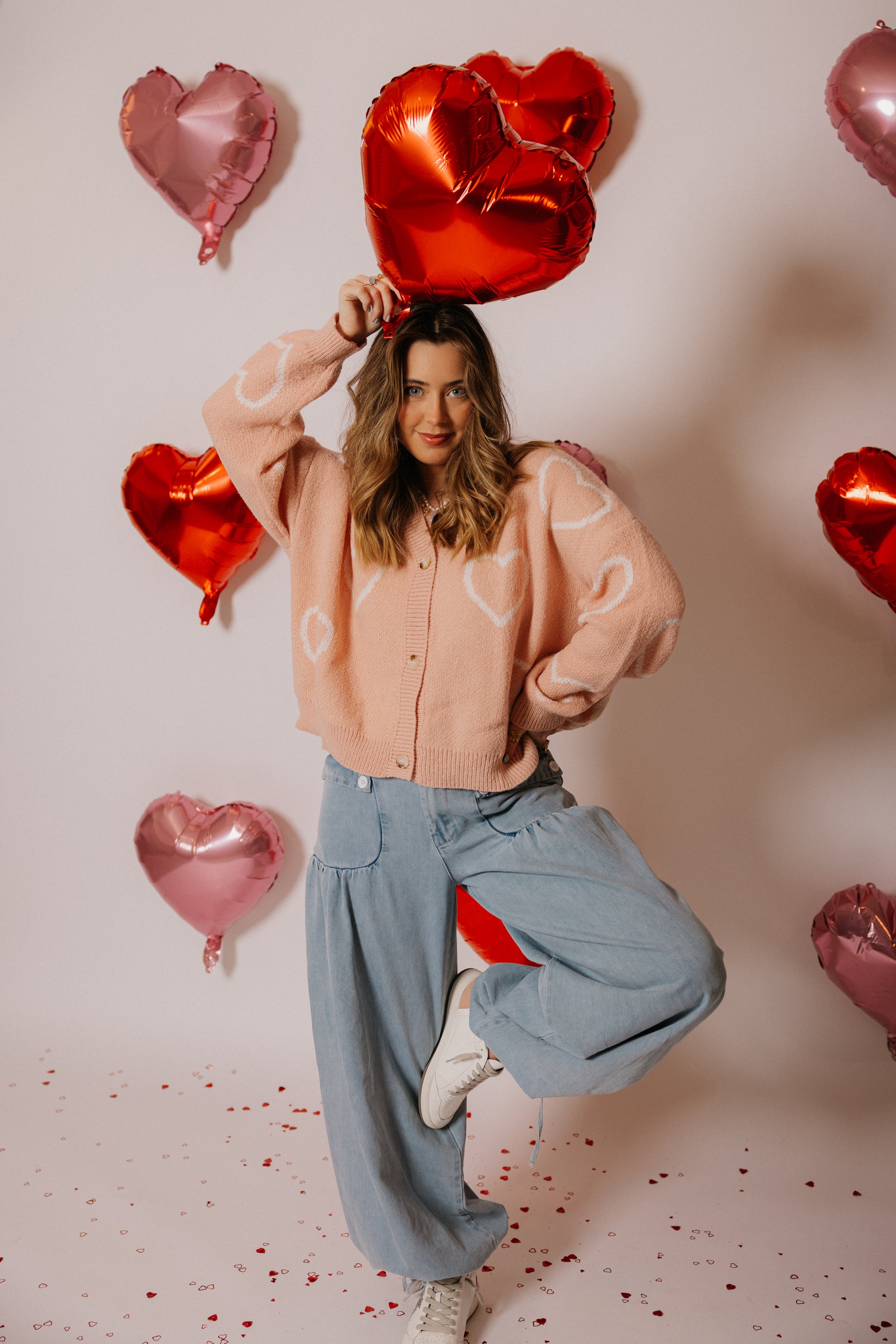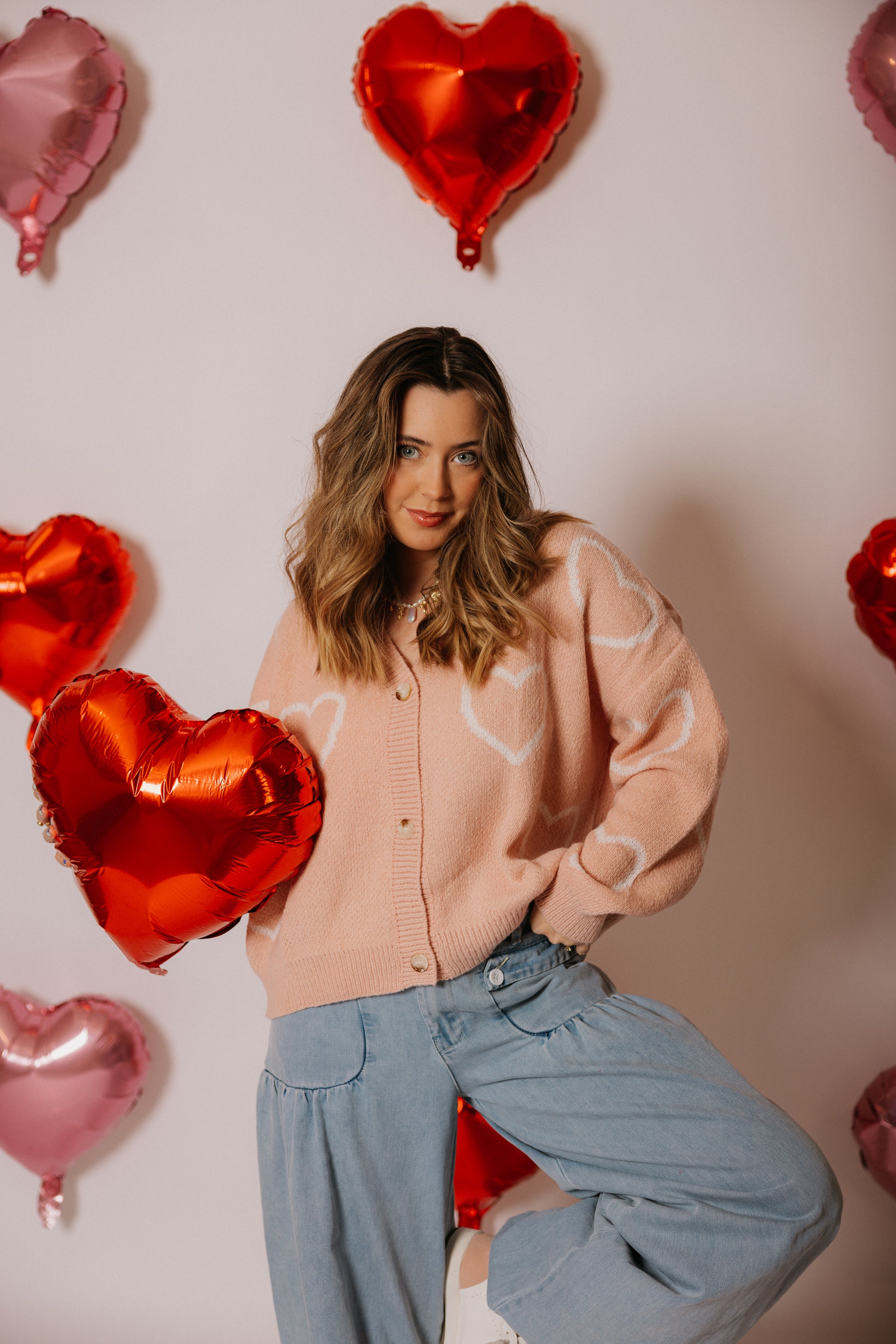 -All Over Heart jaquard shape Sweater Cardigan -Open Front -Rib bands on neckline and bottom hems