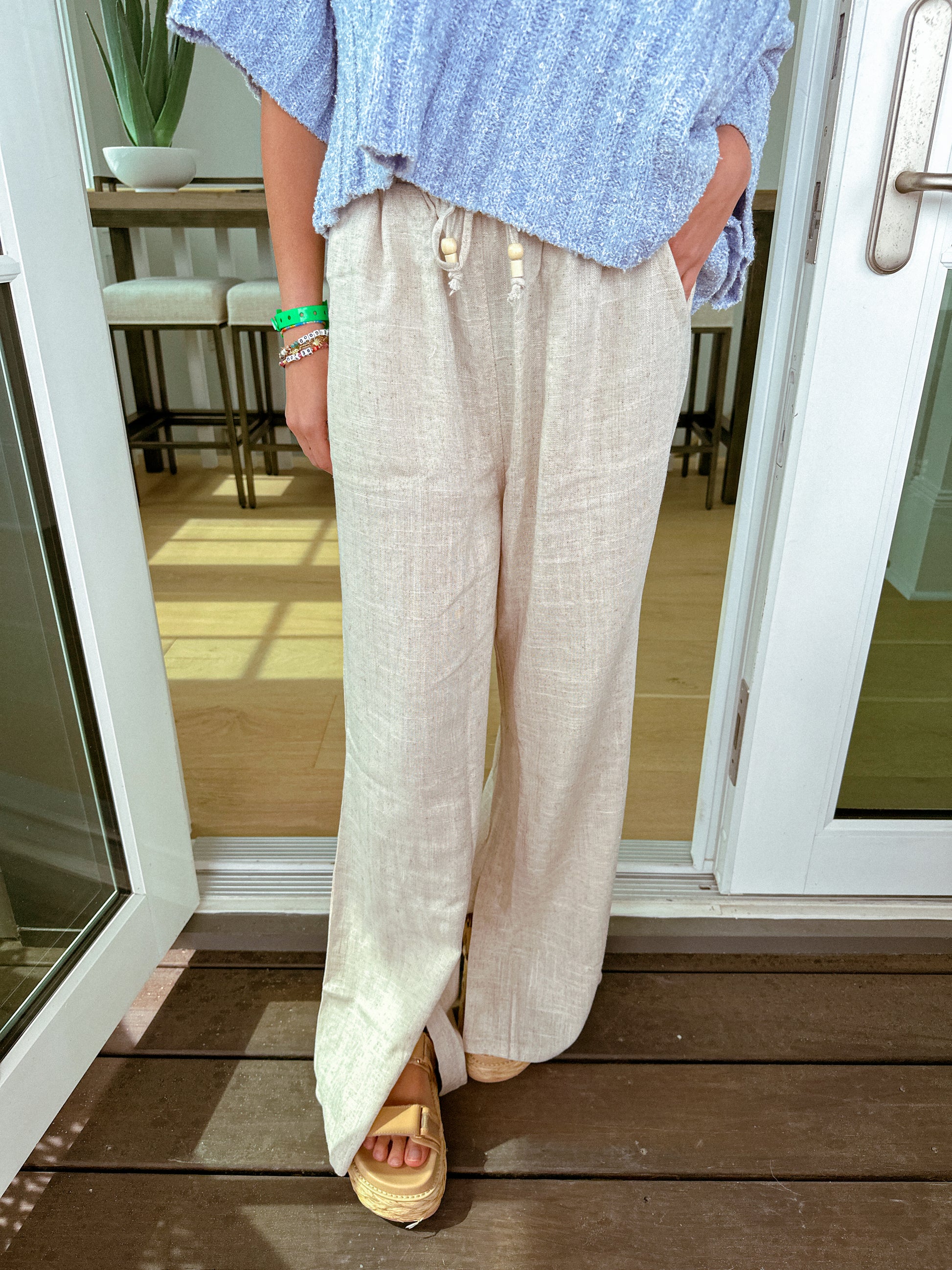 - Elastic Waist Solid Linen Comfy Wide Pants - Waist Drawstring W/ Wood Beads Detail - Side Pockets - Inside Slit Detail - Straight Leg -