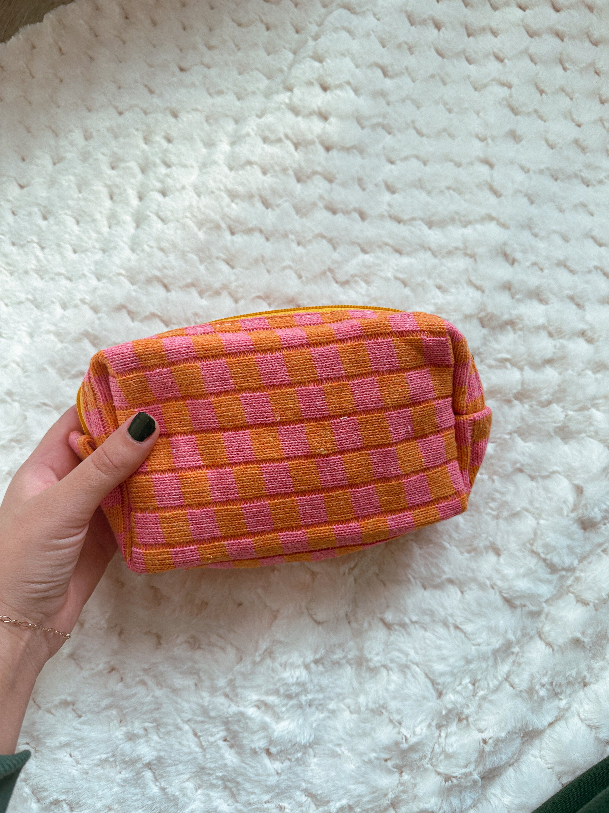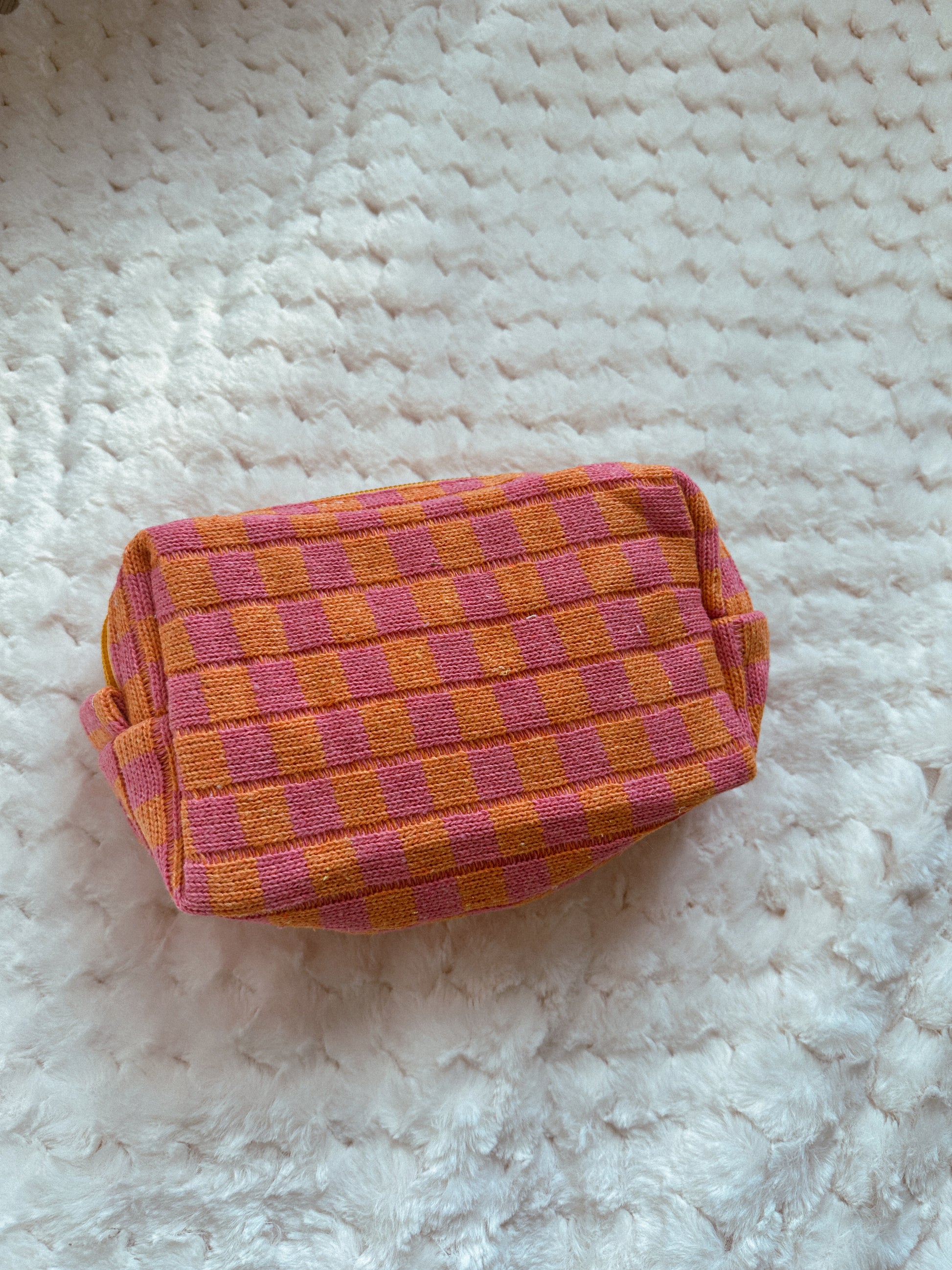 This handy small cosmetic bag is in checkered pattern knitted material. Light Vinyl lining inside. Absolutely adorable!