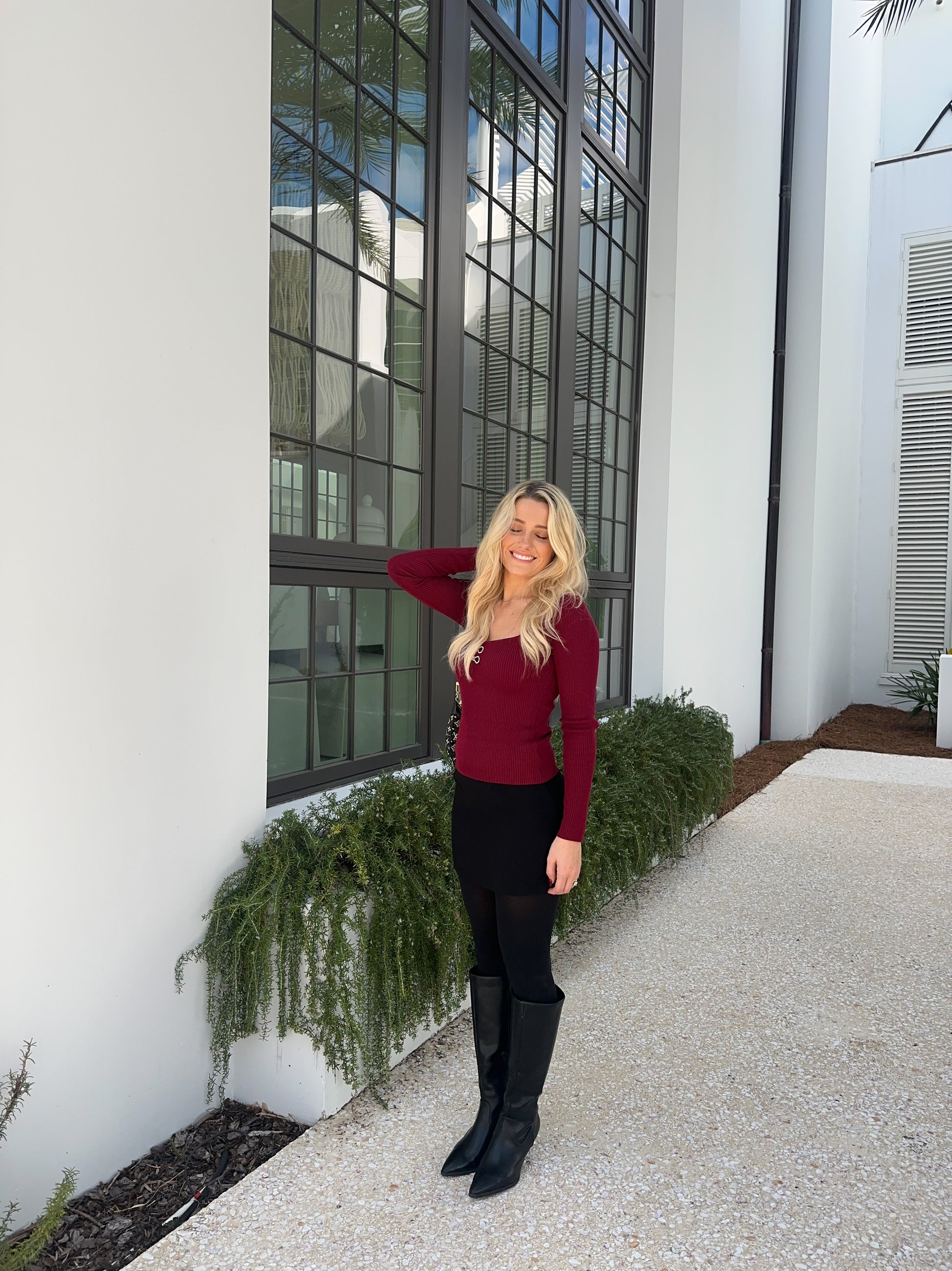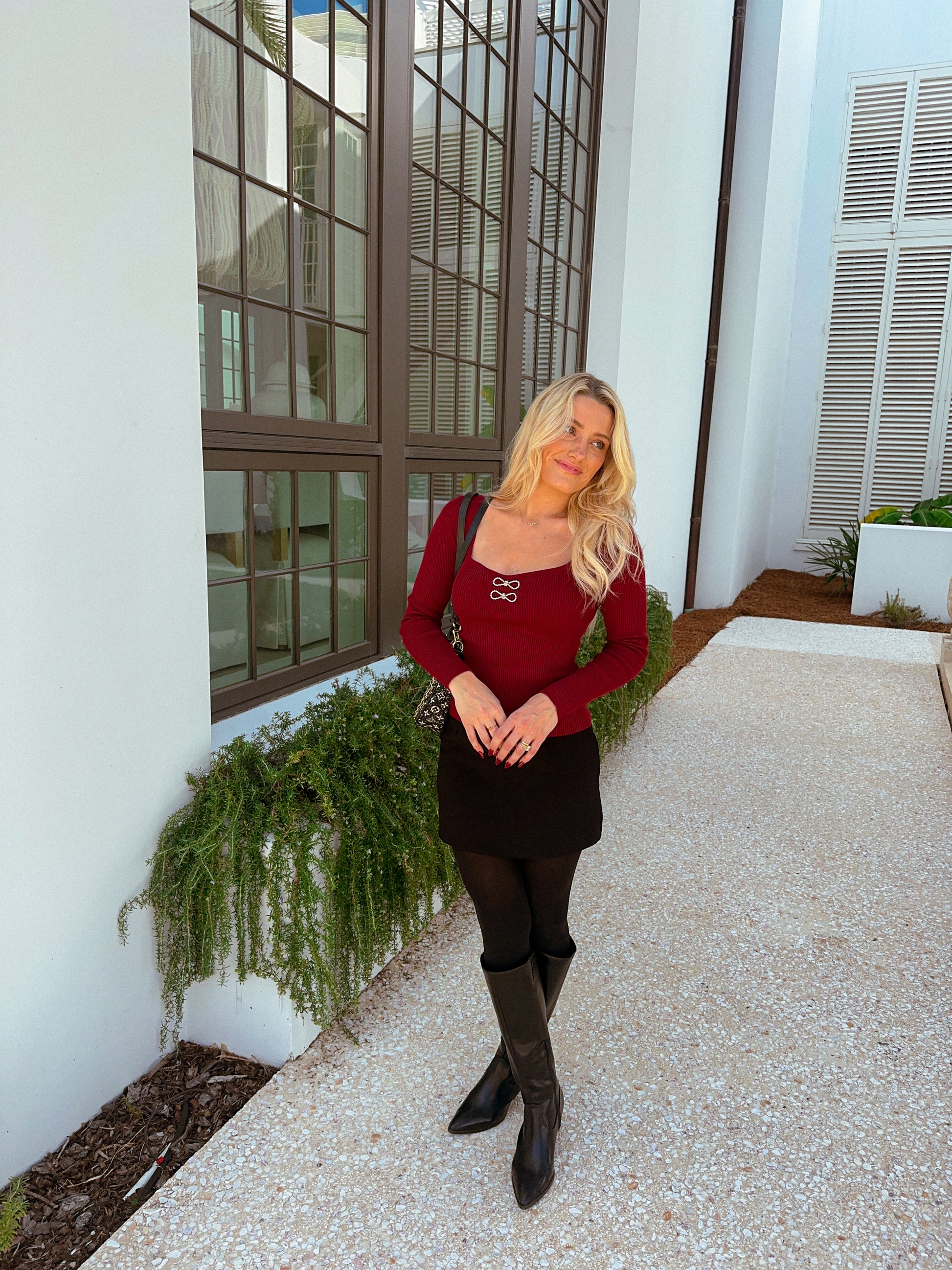 Features a sweetheart neck line with a rhinestone bow on the front. This is a fitted long sleeve sweater top.
