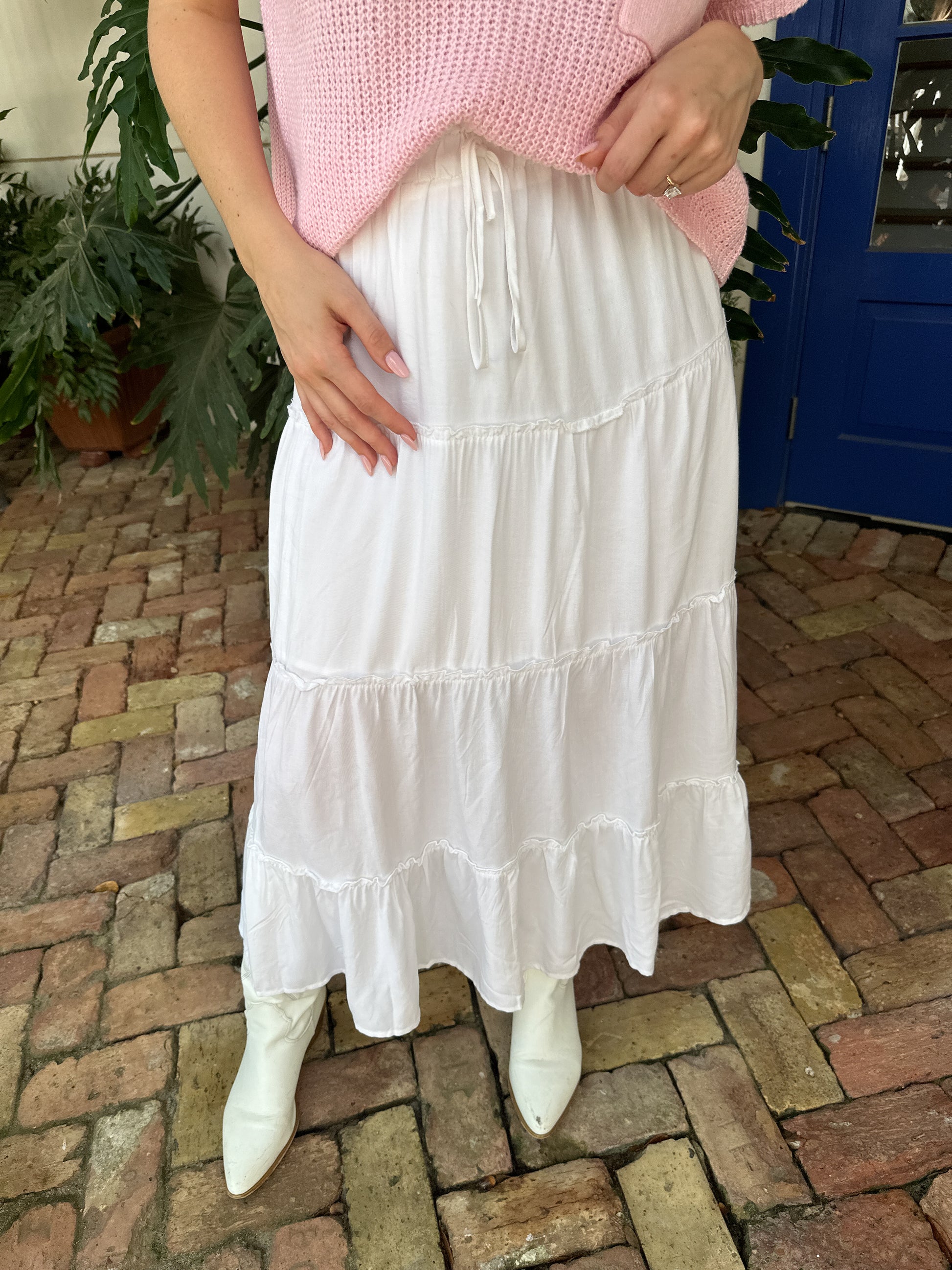 Ruffle Tiered Woven Drawstring Elastic High Rise A-Line Long Maxi Skirt. Lined