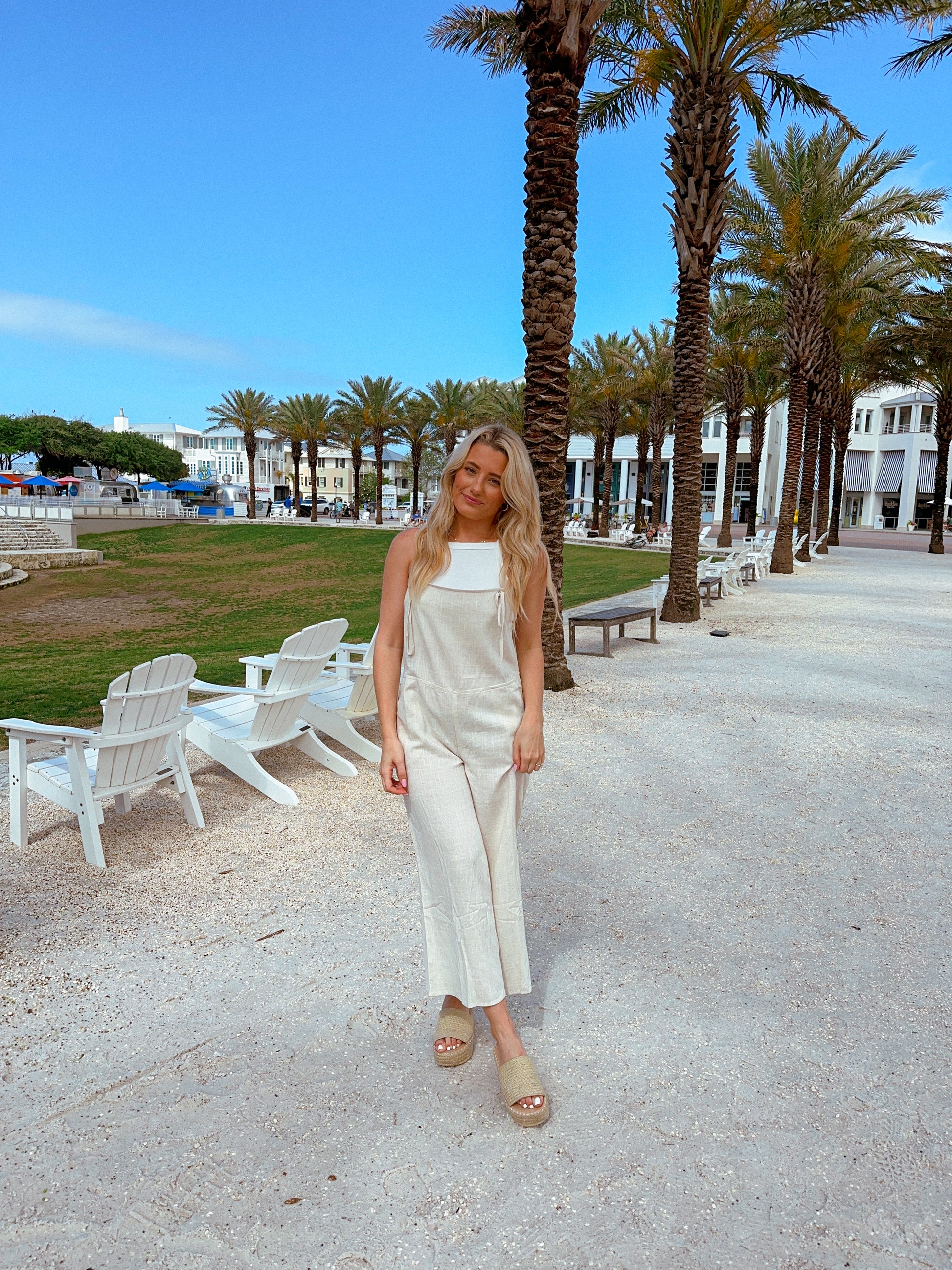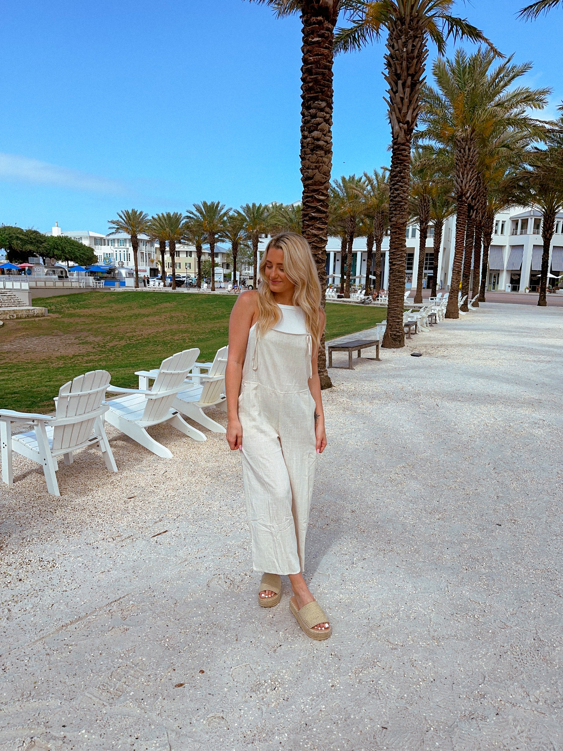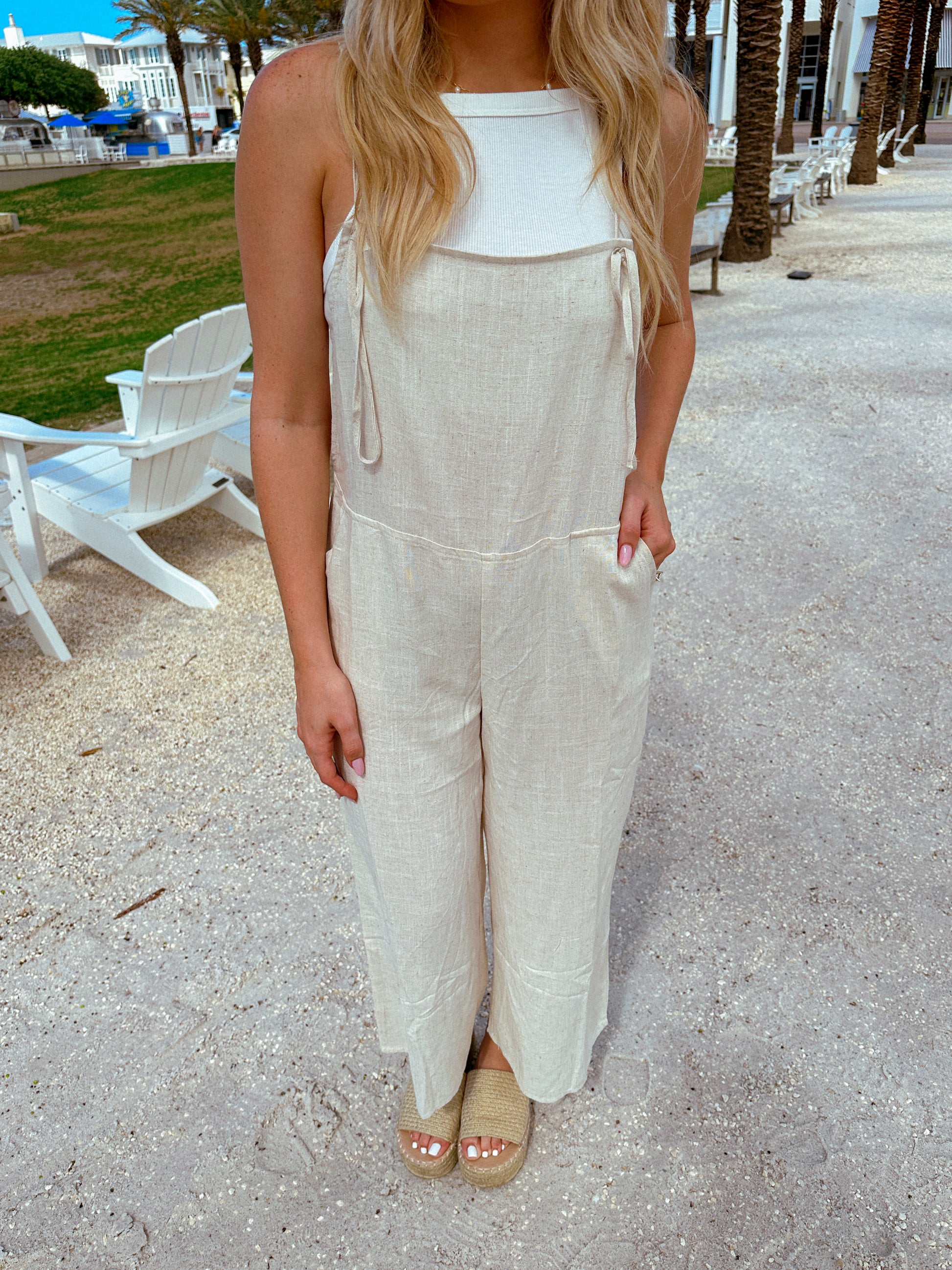 IT IS SHAPED WITH A STRAIGHT NECK, TIE SHOULDER STRAPS AND AN EFFORTLESSLY CHIC SILHOUETTE WITH WIDE LEGS THAT END AT SLIGHTLY CROPPED HEMS.