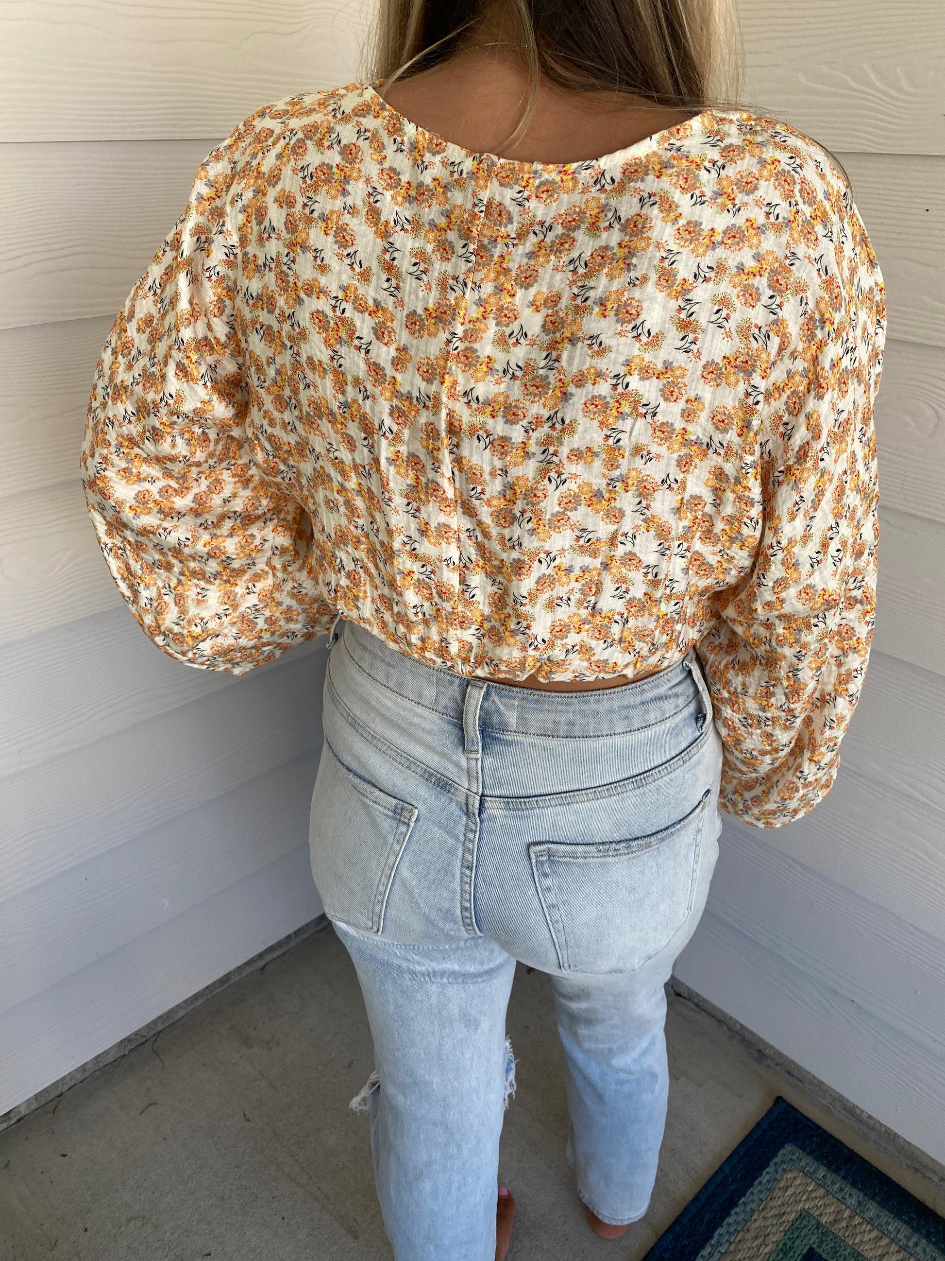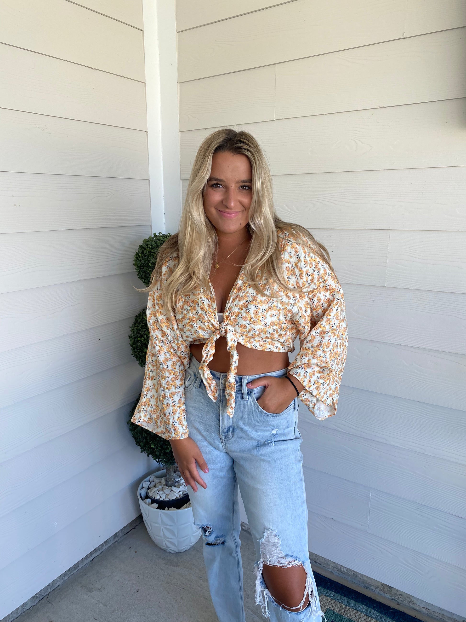 FLORAL WOVEN FRONT TWIST KNOT BLOUSE SHIRTS -PLUNGING NECKLINE -FRONT TIE CLOSURE -LOOSE FITTED -SOFT FABRICATION -ELASTIC WAISTBAND -FRONT KNOT