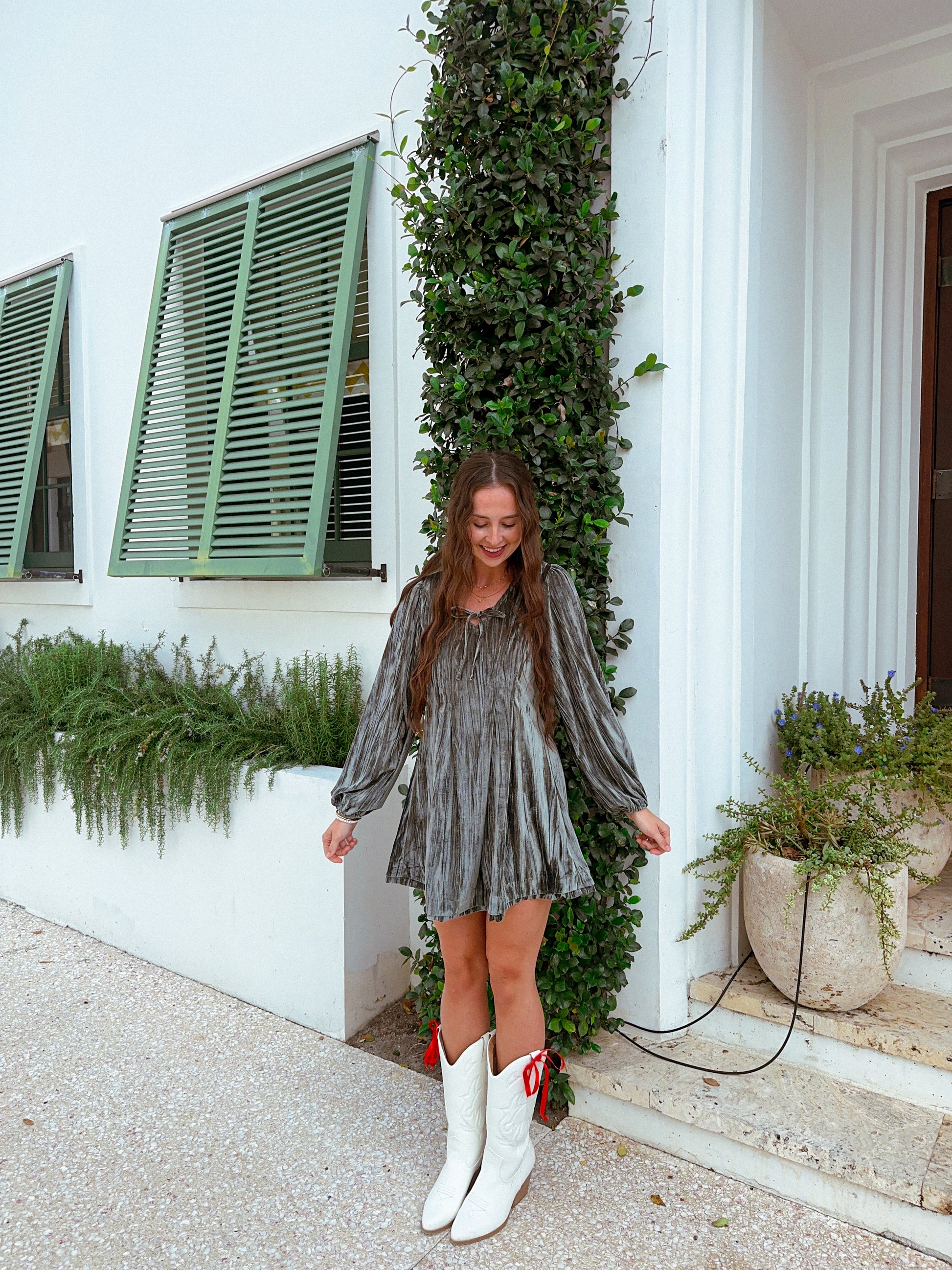- Front Ribbon Velvet Holiday Mini Flare Dress - Pleats Detail - Long Sleeve - V-Neck - A-Line