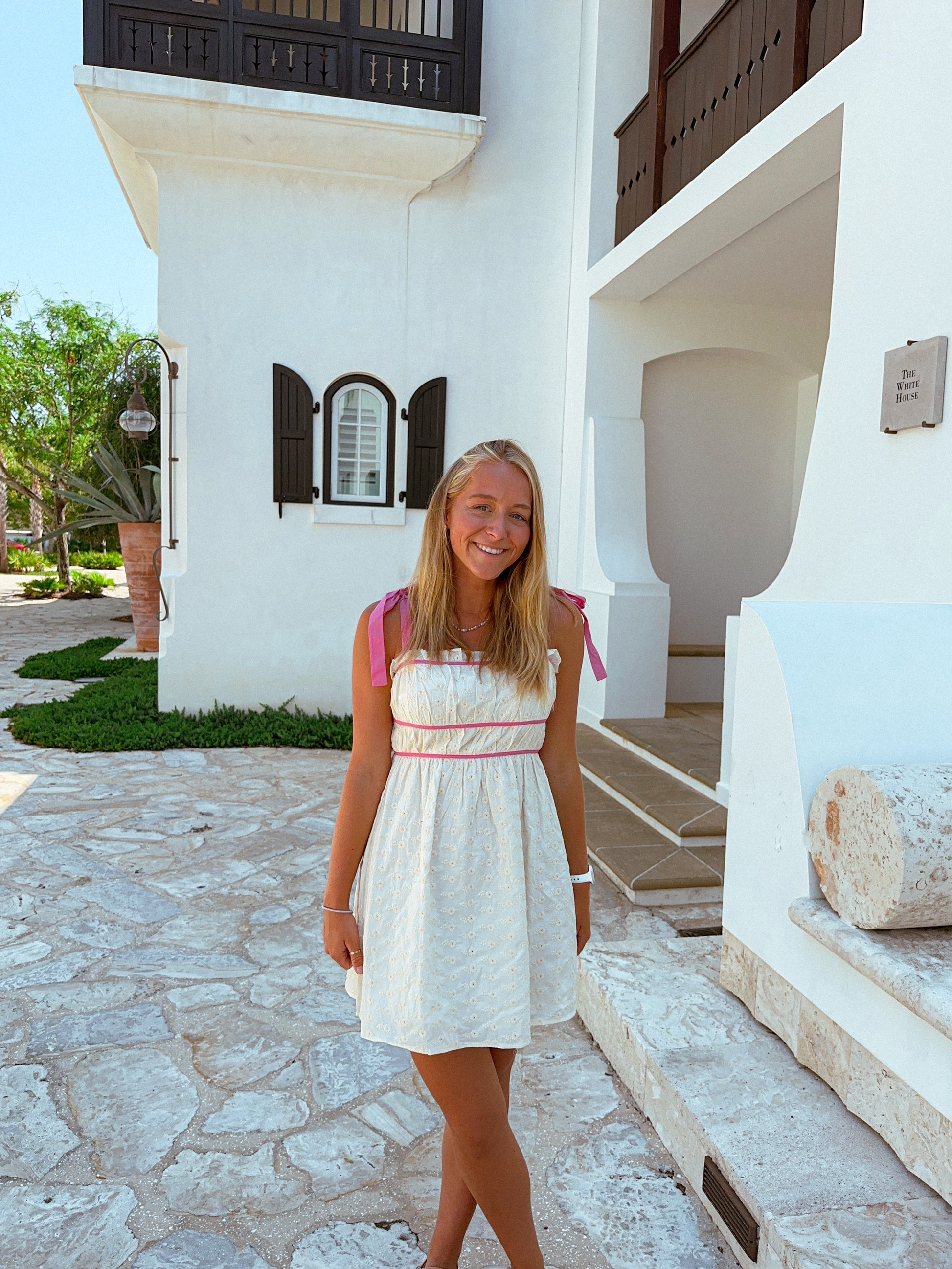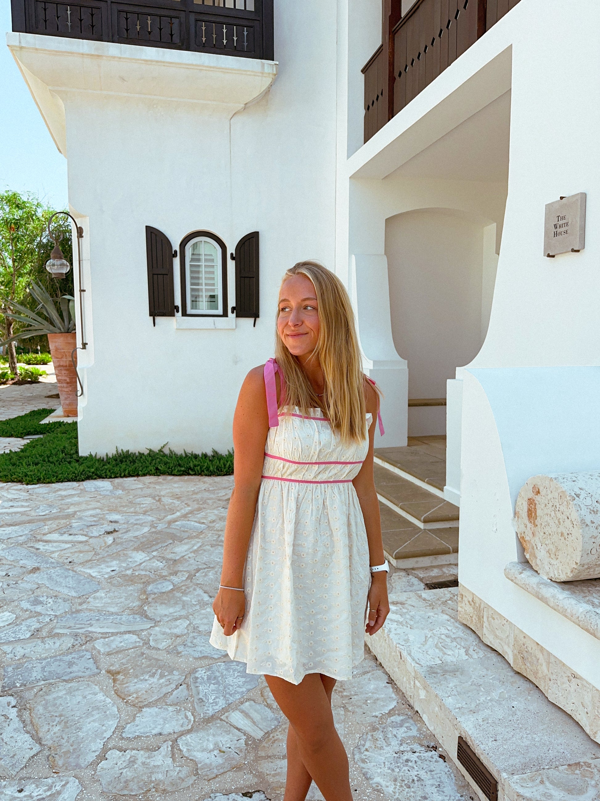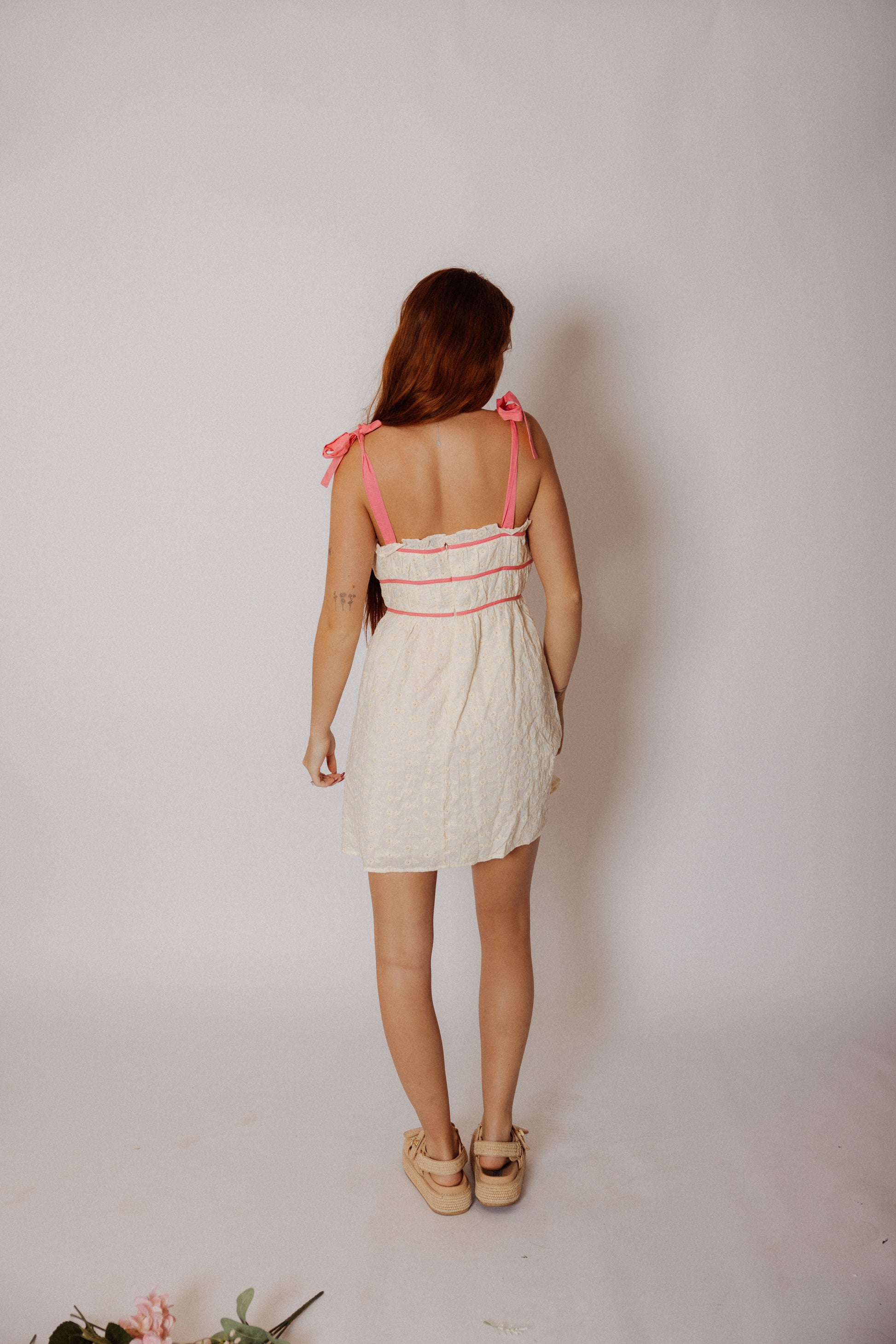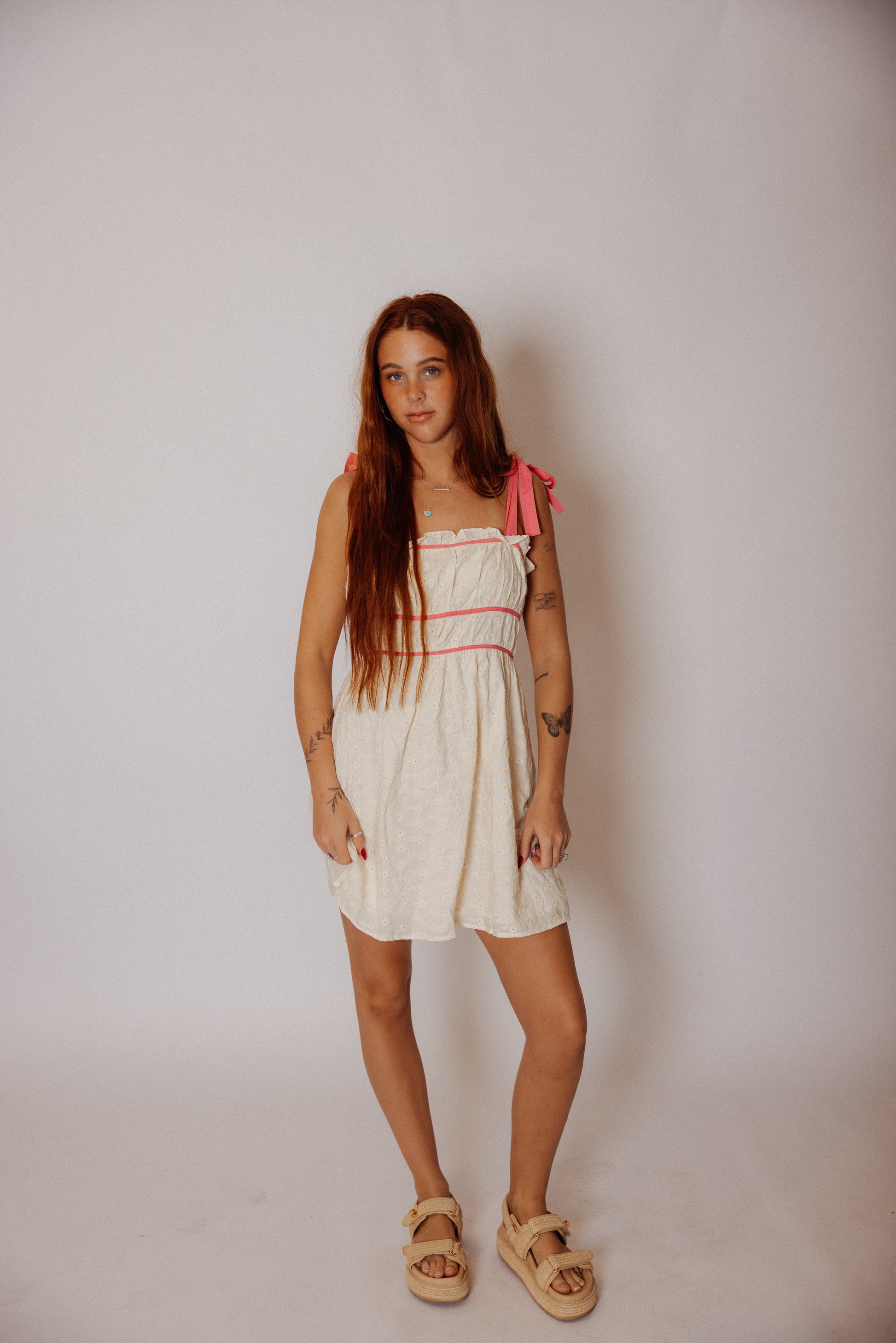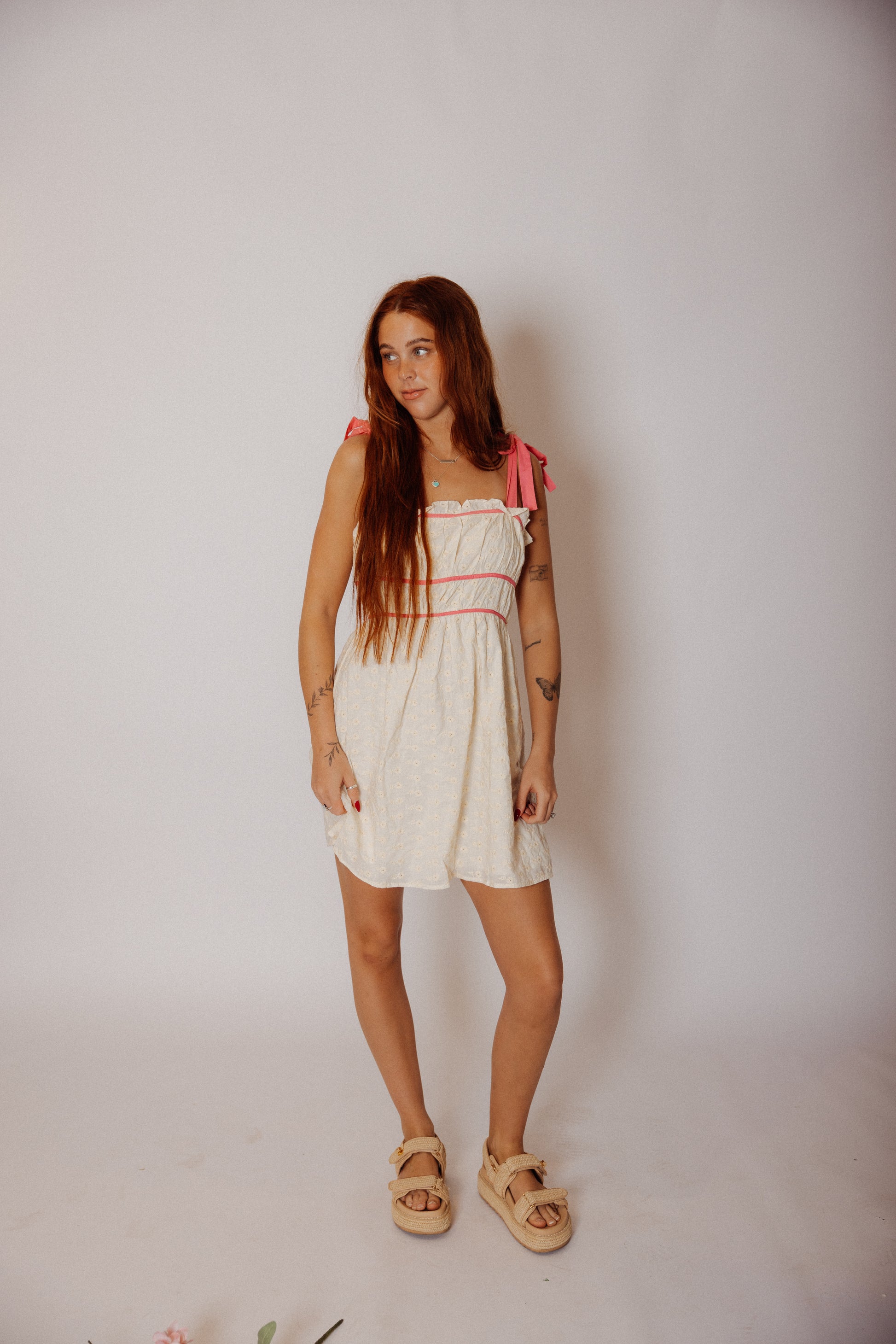 -Floral embroidered mini dress with contrast binding details. -Contrast shoulder tied strap. -Back invisible zipper with hook & eye -Has lining