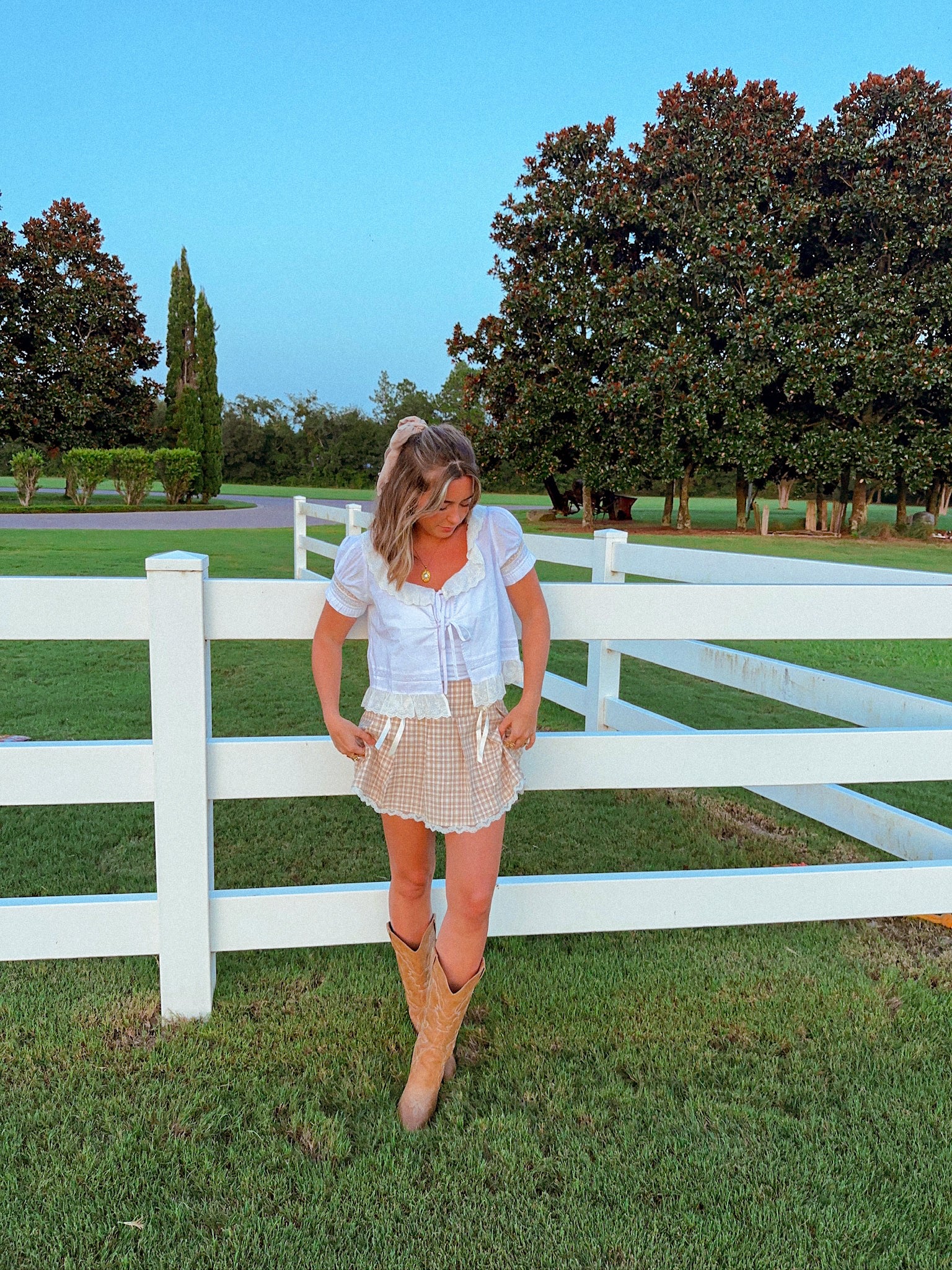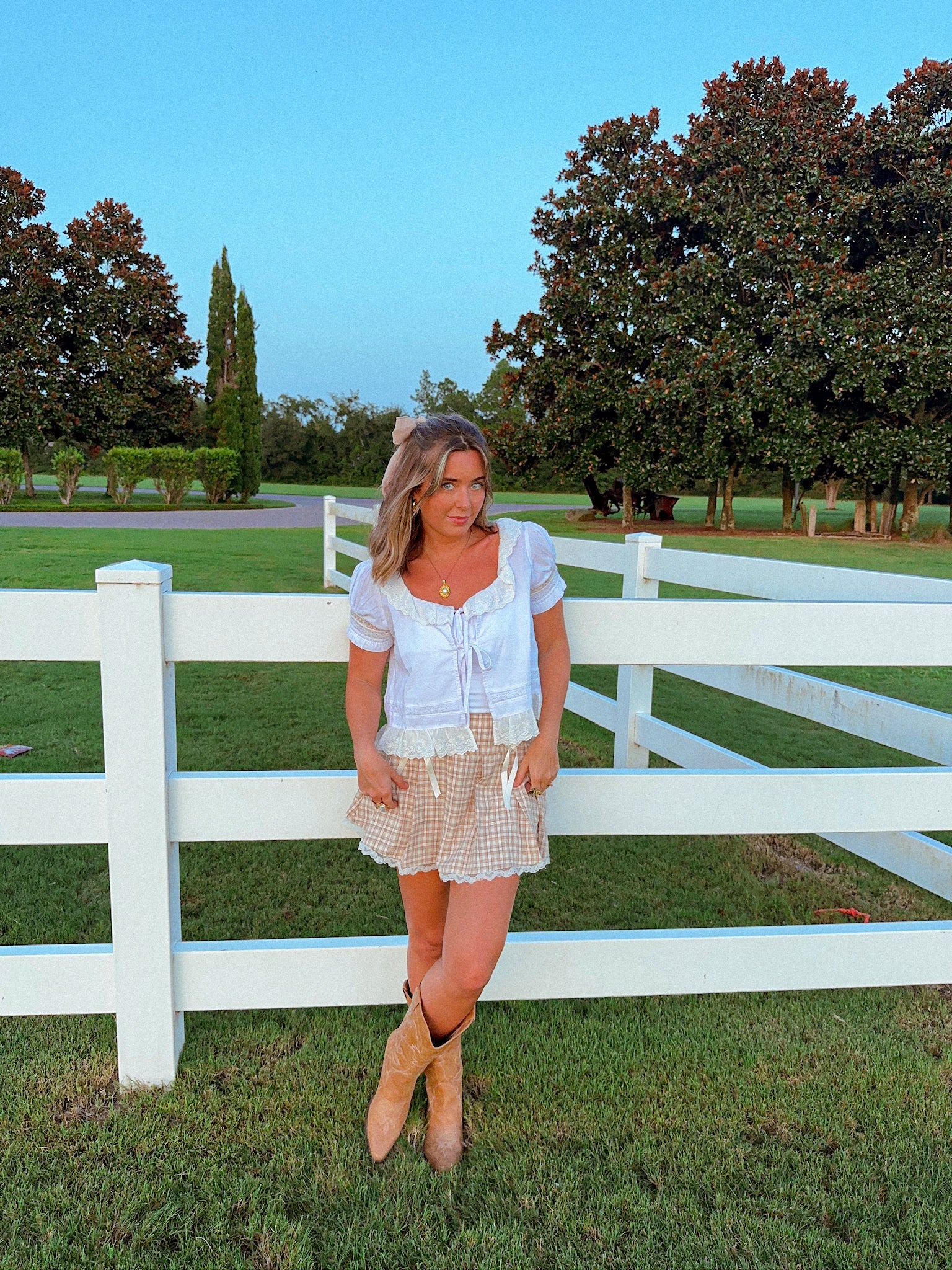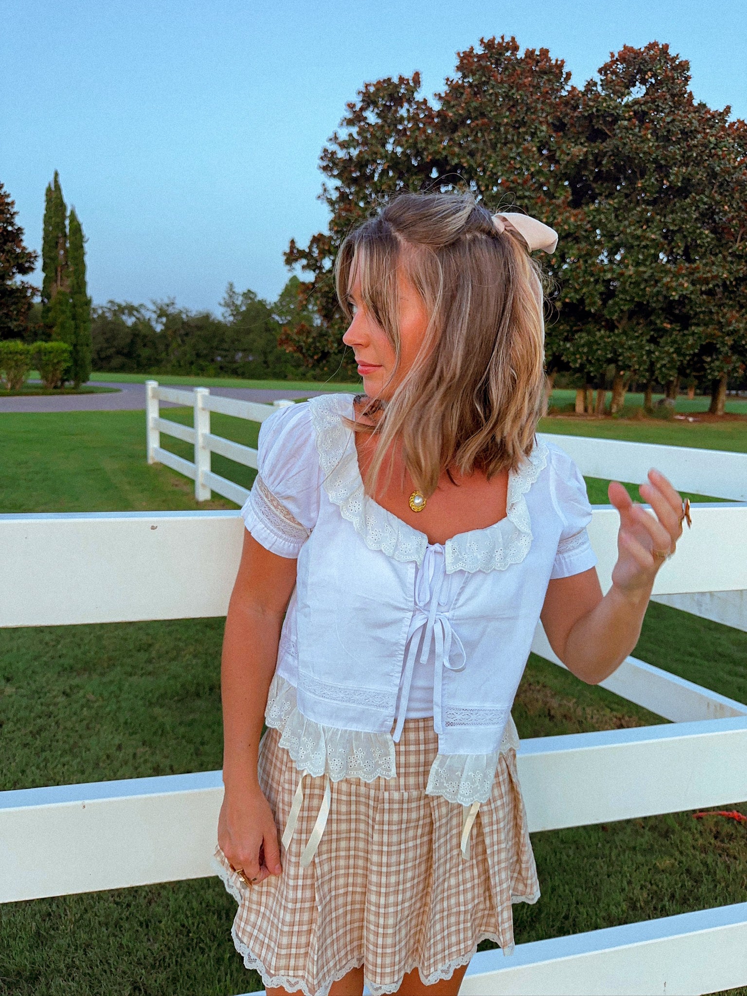 This charming white blouse showcases a delicate eyelet lace trim, dainty puff sleeves with intricate lace insets, a soft ruffled neckline, and a feminine tie front closure, all in a breezy, cropped silhouette for a vintage inspired, romantic aesthetic.