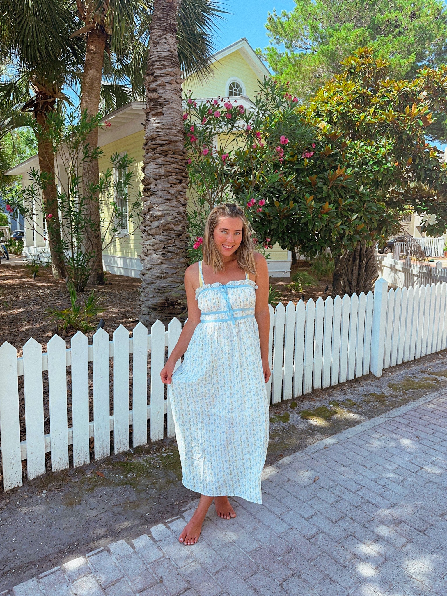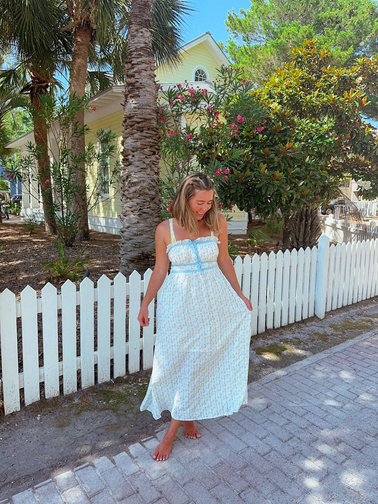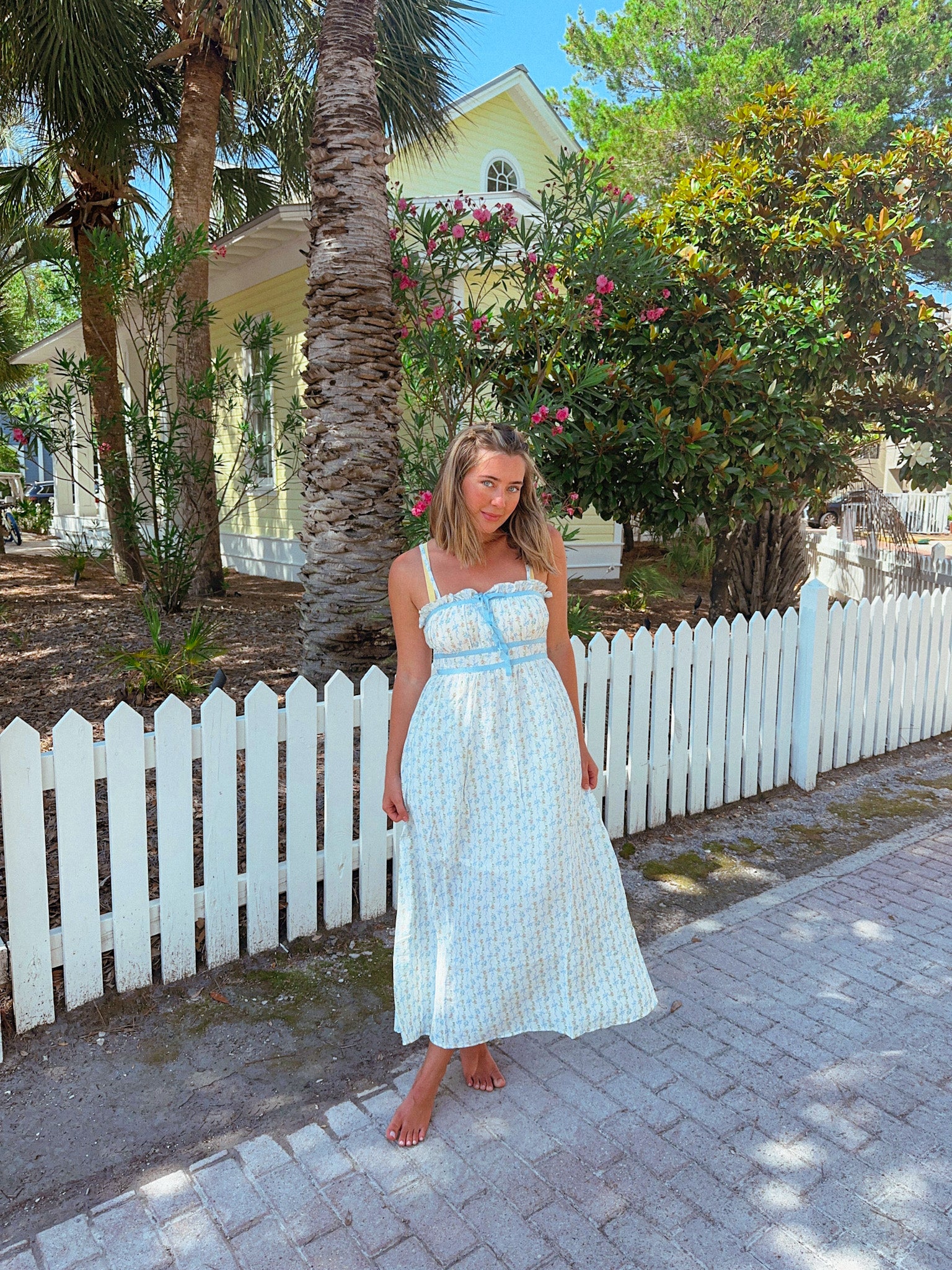 SQUARE NECKLINE RUFFLE TRIM ADJUSTABLE SPAGHETTI STRAP CONTRAST FRONT TIE DETAIL ELASTIC BACK WAIST TUNNEL FLORAL BOW PATTERN LINED MIDI DRESS