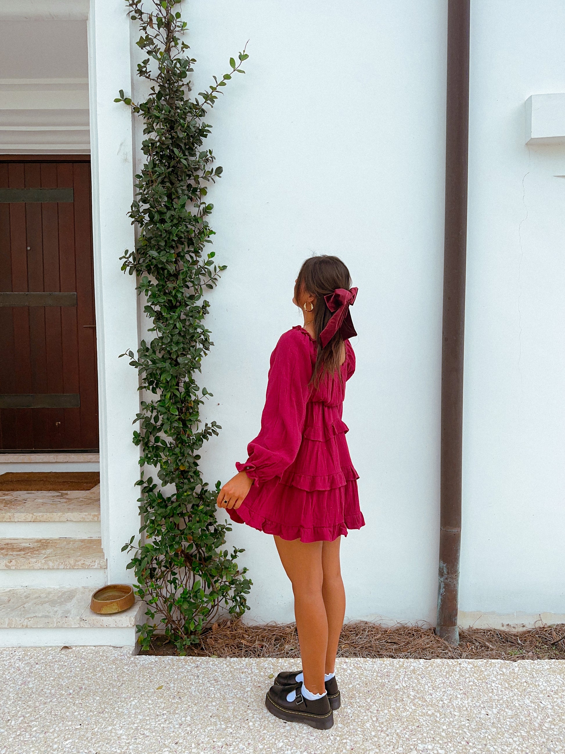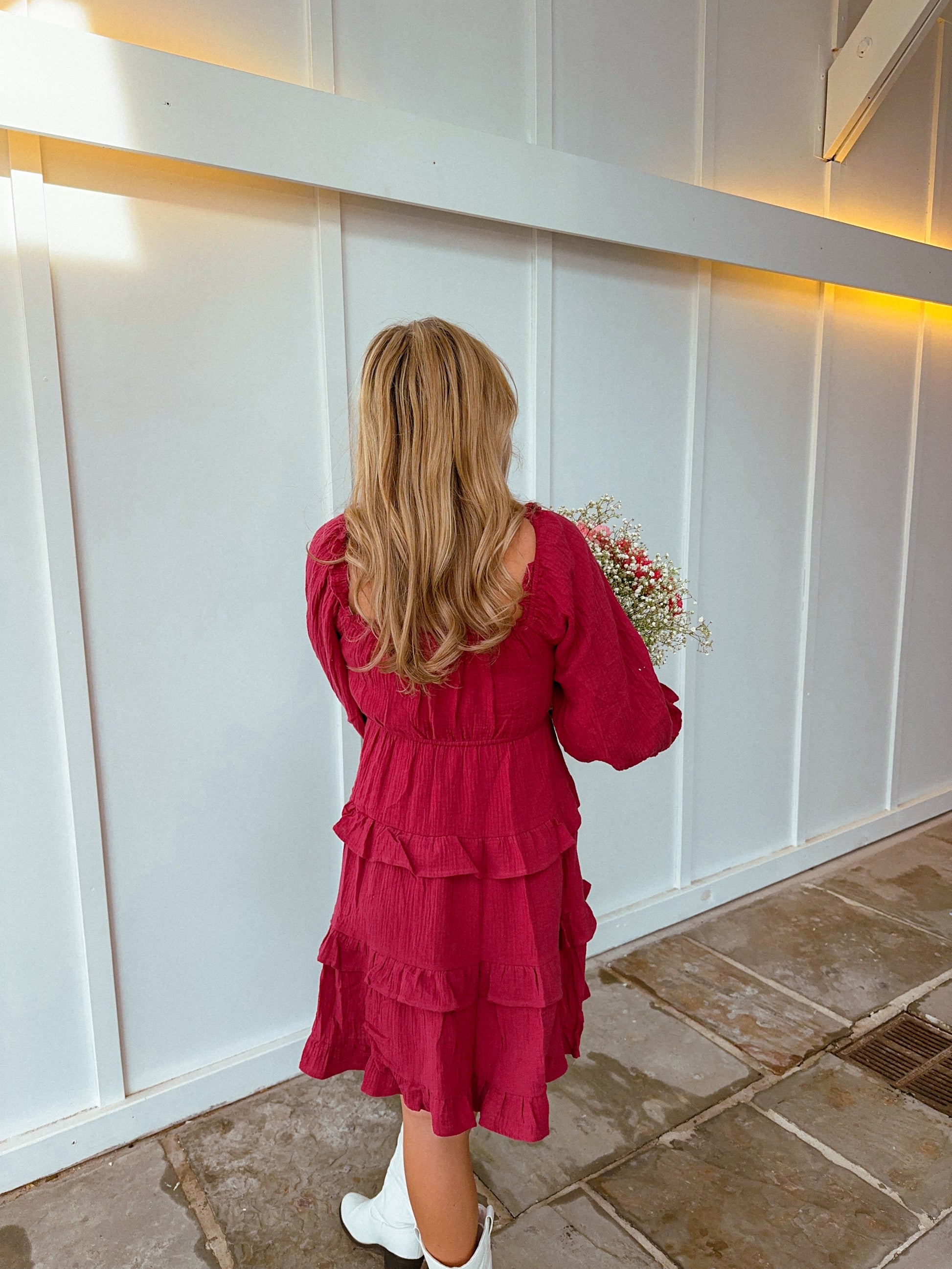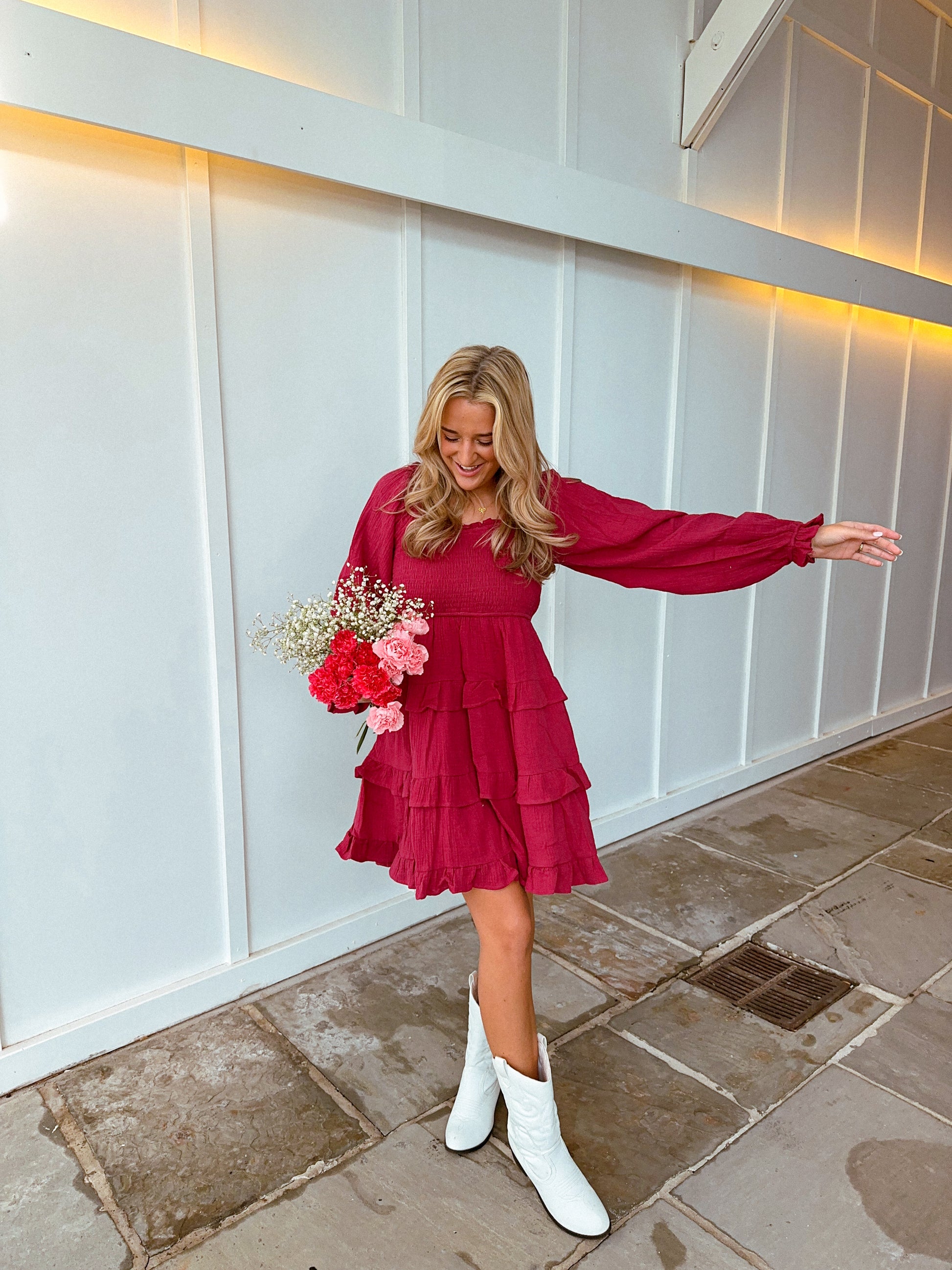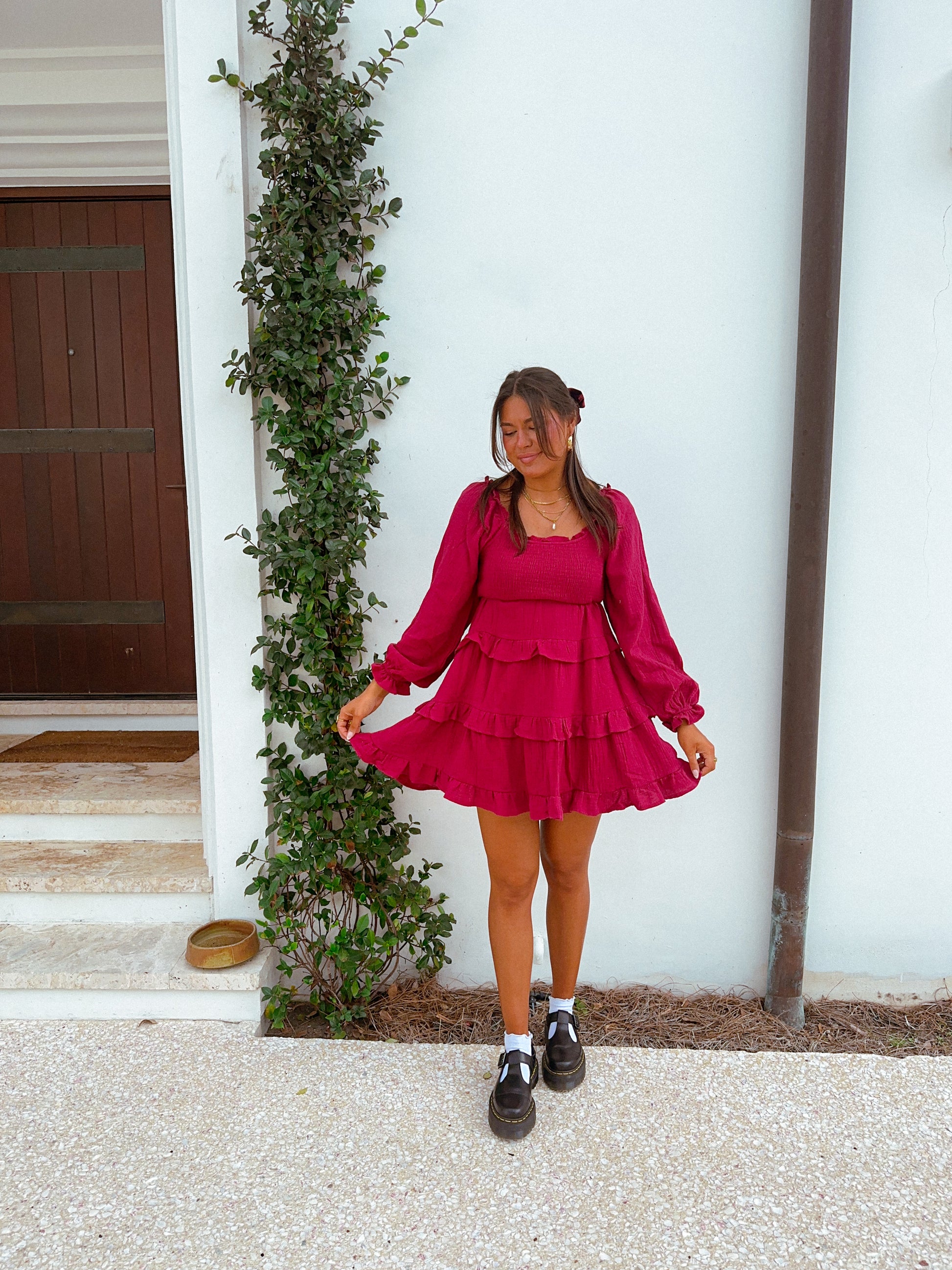 + Square neckline + Long sleeves with elastic cuffs + Smocked elastic bodice + Tiered skirt seam with ruffle trim